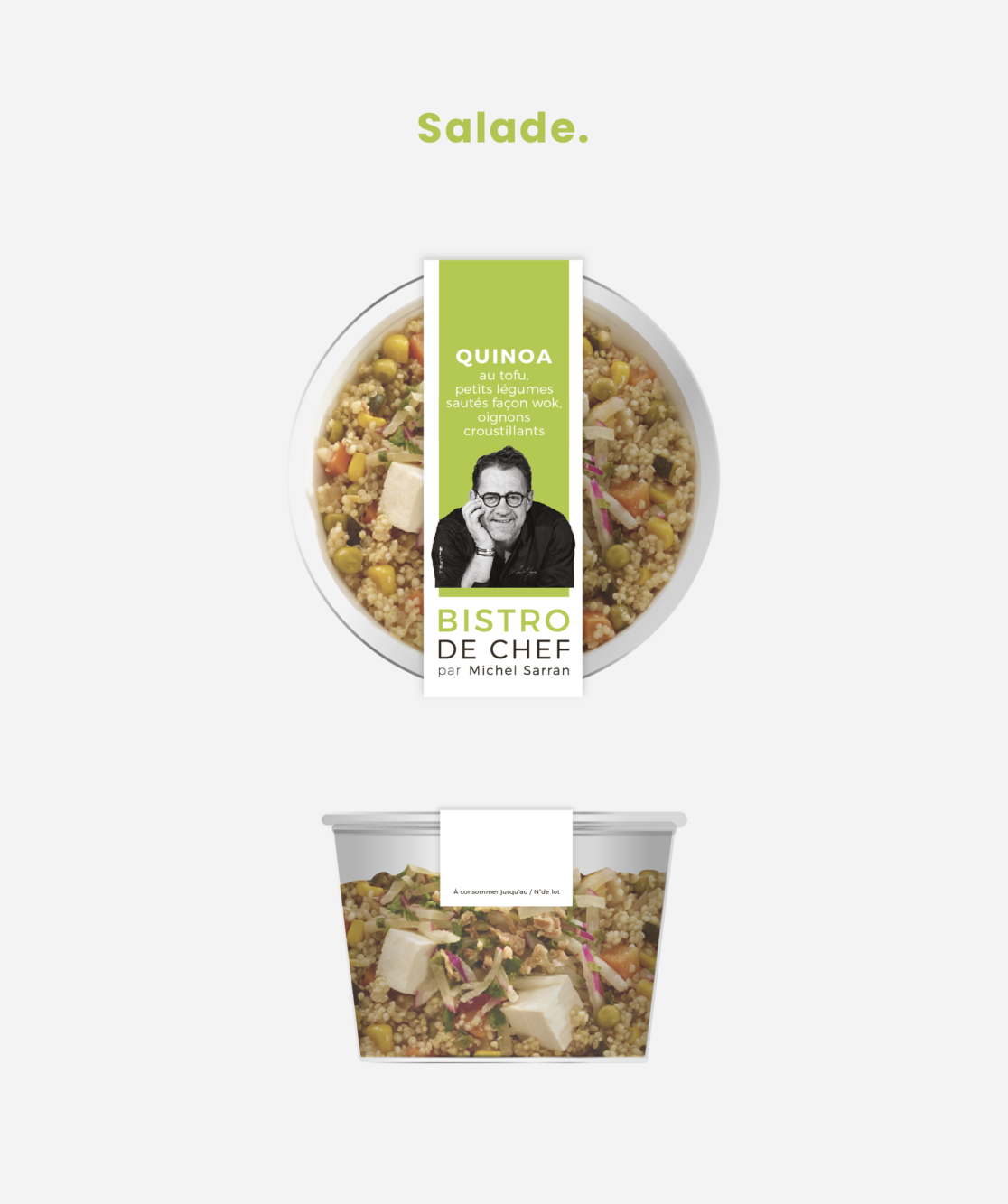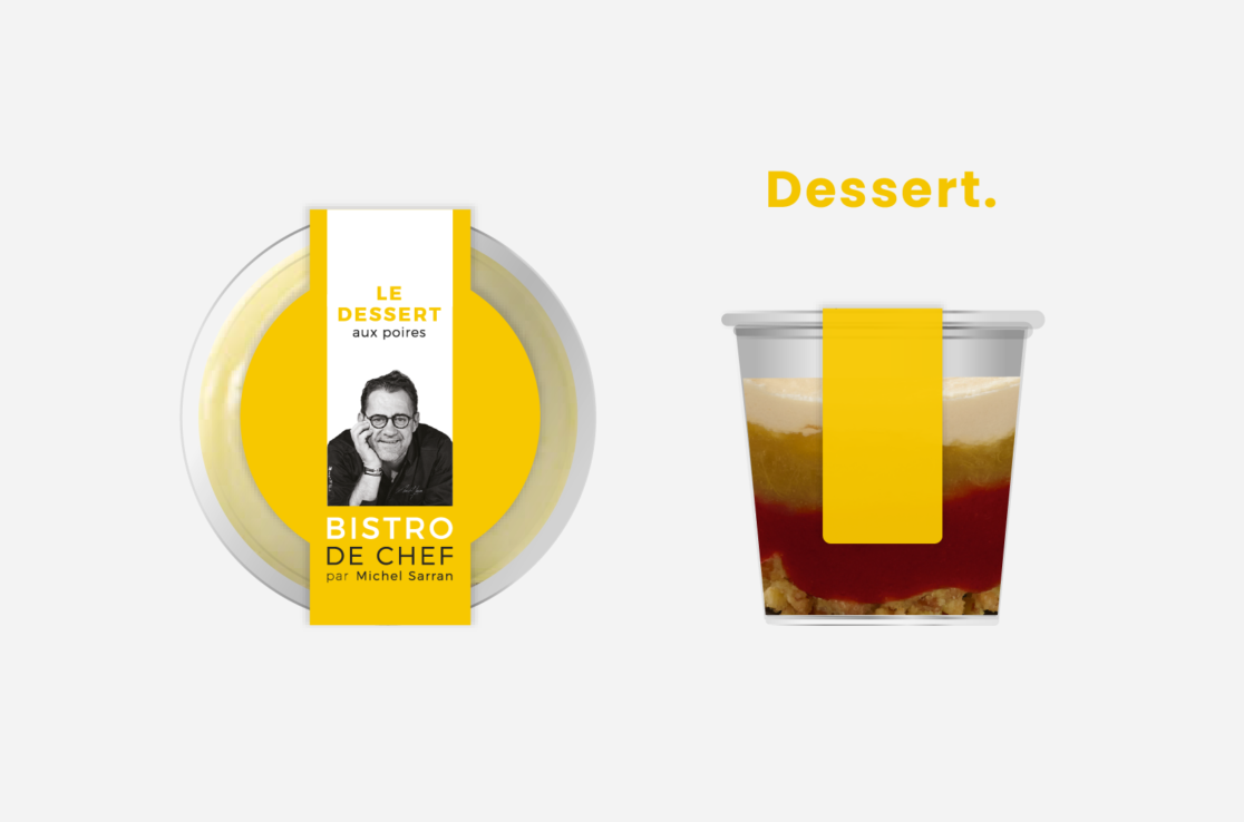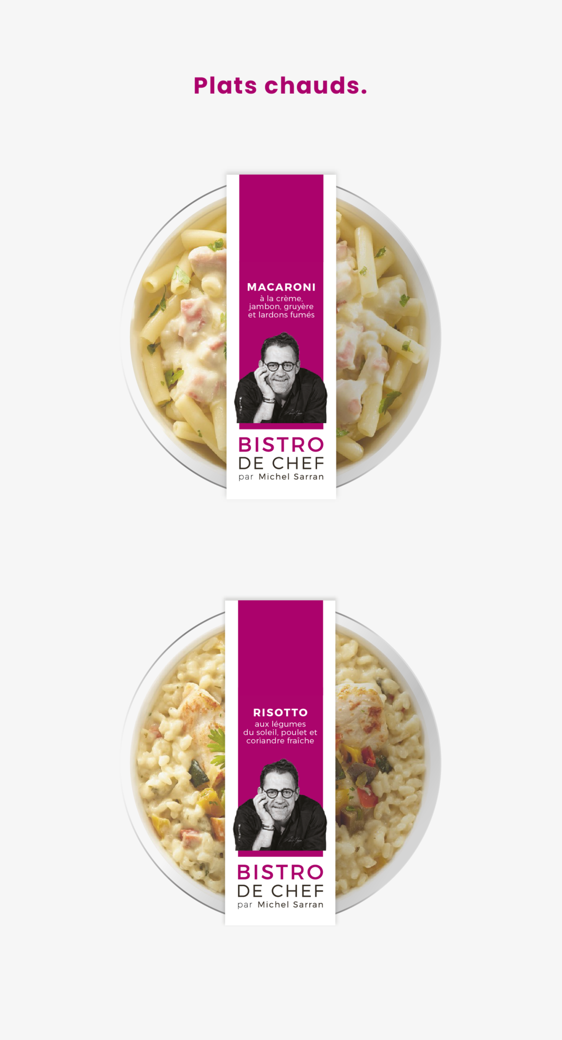 ACCESSIBILITÉ ∴ Un chef accessible, qui ouvre ses talents de Chef doublement étoilé au grand public en créant une gamme peu onéreuse et qualitative. L’accessibilité exprimé dans le logo par l’usage de couleurs vives (qui viennent contrecarrer le sérieux du noir et blanc), le visage ouvert, souriant, détendu posé dans la main du Chef Sarran, et un ensemble de formes rondes ponctuelles qui permettent d’assouplir la composition carrée du logo. L’idée est de créer un équilibre entre l’univers luxueux de la haute gastronomie incarnée par Michel Sarran, et l’offre de restauration rapide qu’il propose pour la marque ‘Bistro de Chef’.