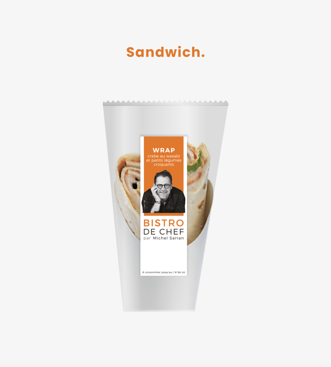 Logo décliné sur le packaging selon les produits via un système d’aplat coloré (vert pour les salade, orange pour les sandwichs, jaune pour les desserts, violet SNCF pour les plats chauds)